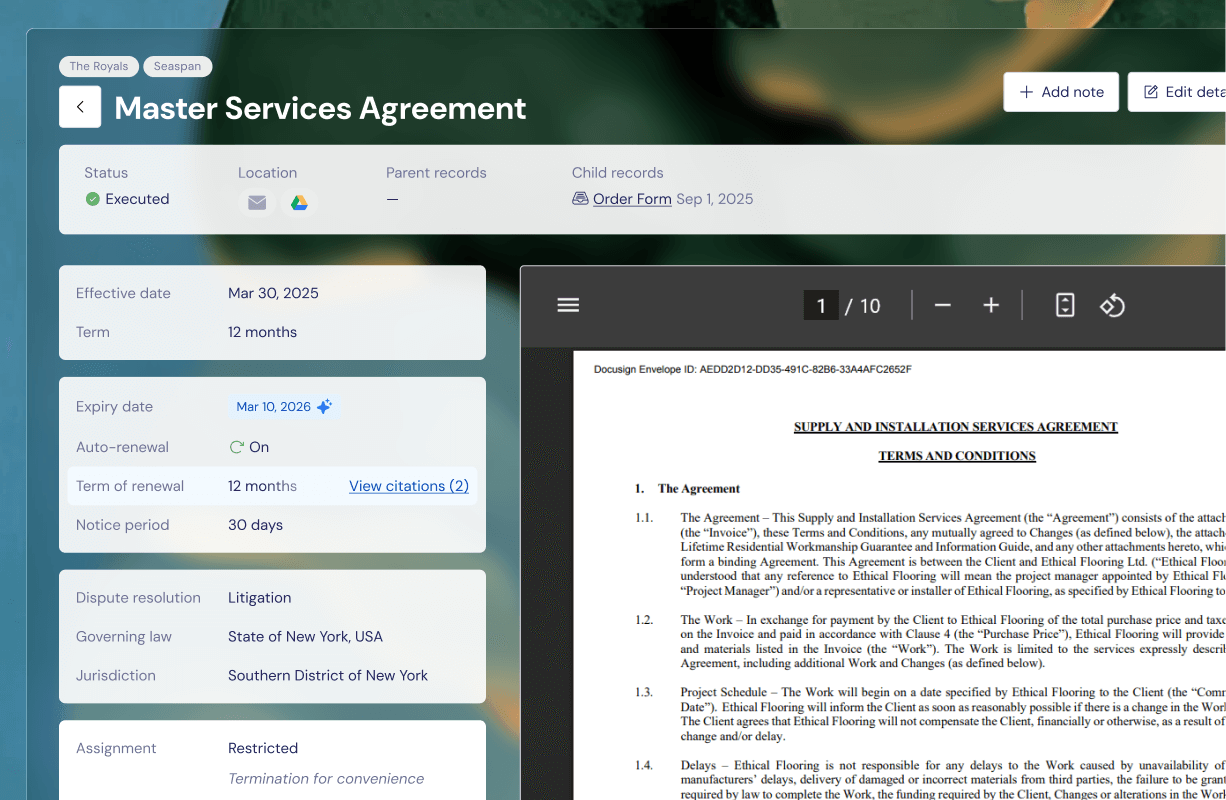 Connect one or more contract sources and automatically extract key terms, dates, and obligations. No manual cleanup or review required.
