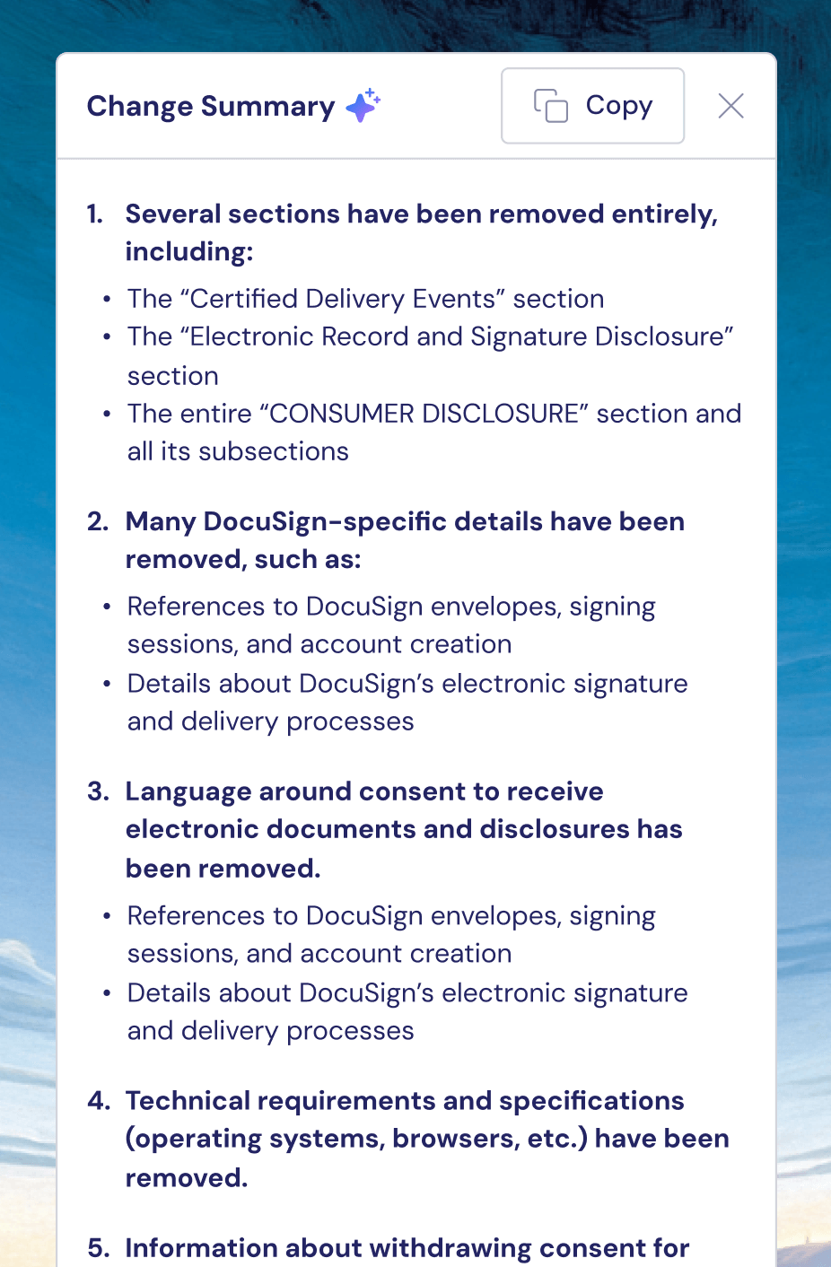 Generate an at-a-glance summary of changes to quickly identify key legal or business implications. Ideal for quickly briefing internal stakeholders.